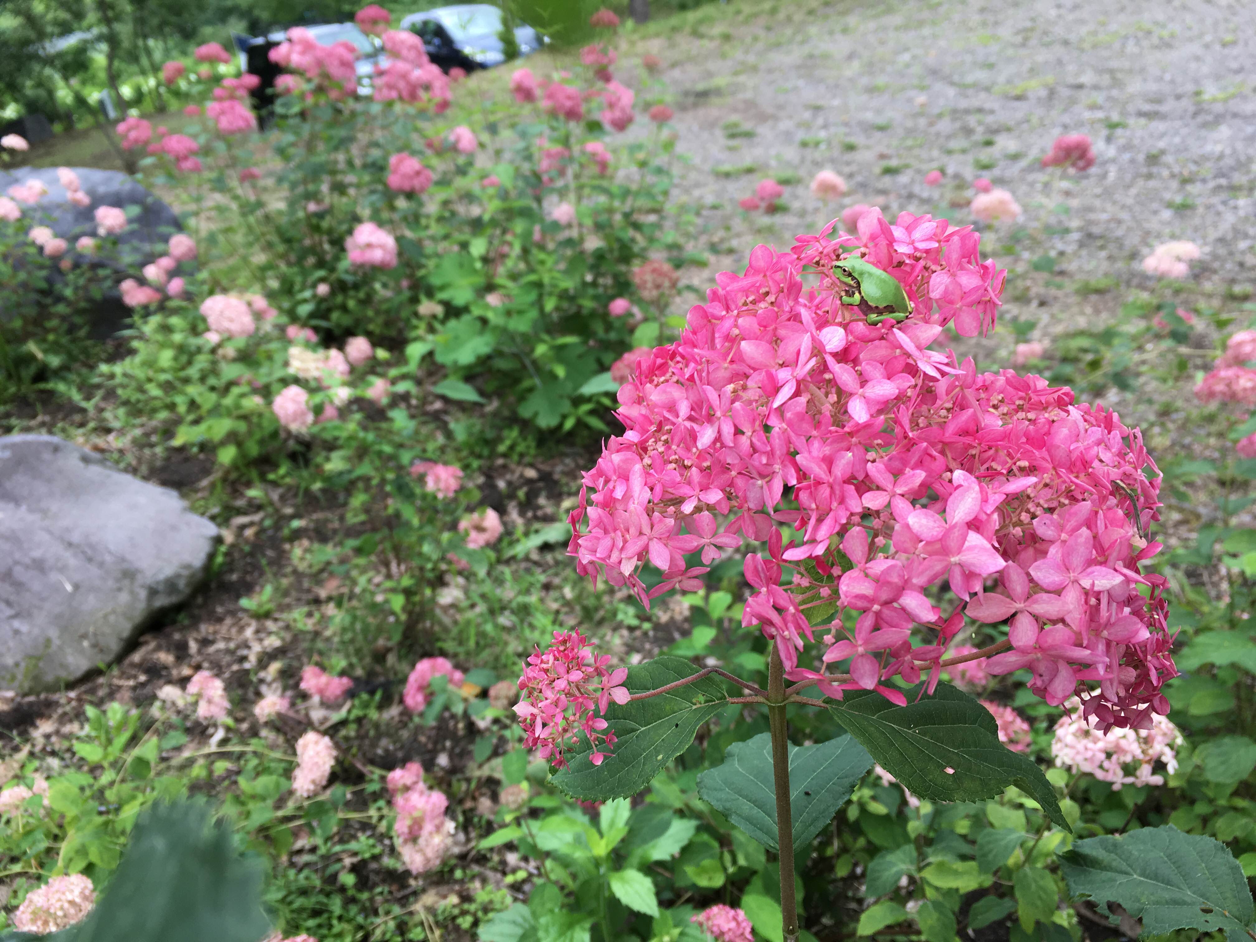 かわいらしいピンクのアナベルの上に、小さなアマガエルを発見!つやのあるフレッシュなグリーンとピンクのコントラストがとても綺麗です。